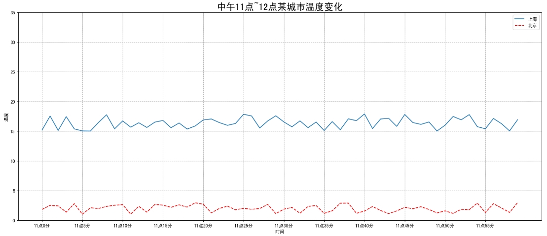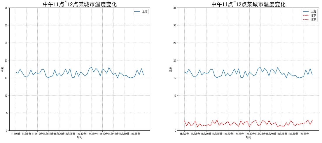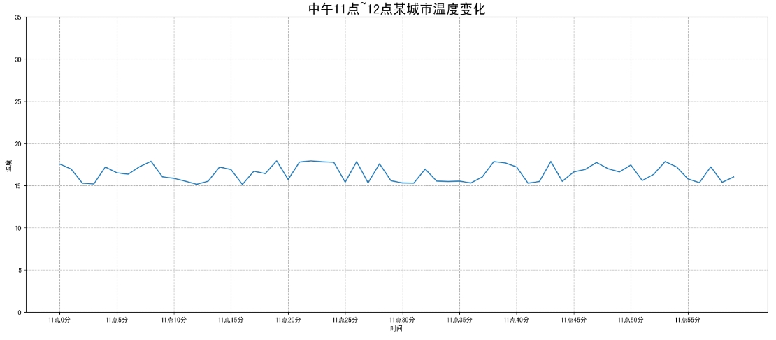 axes[0].set_title("中午11点~12点某城市温度变化",fontsize=20)